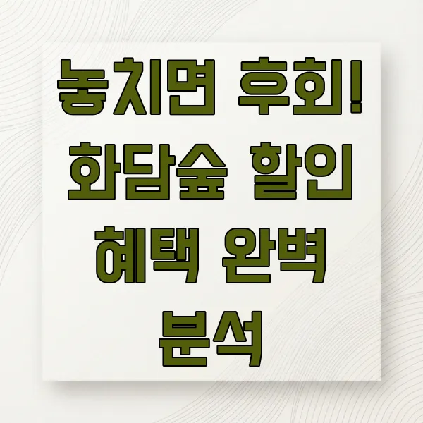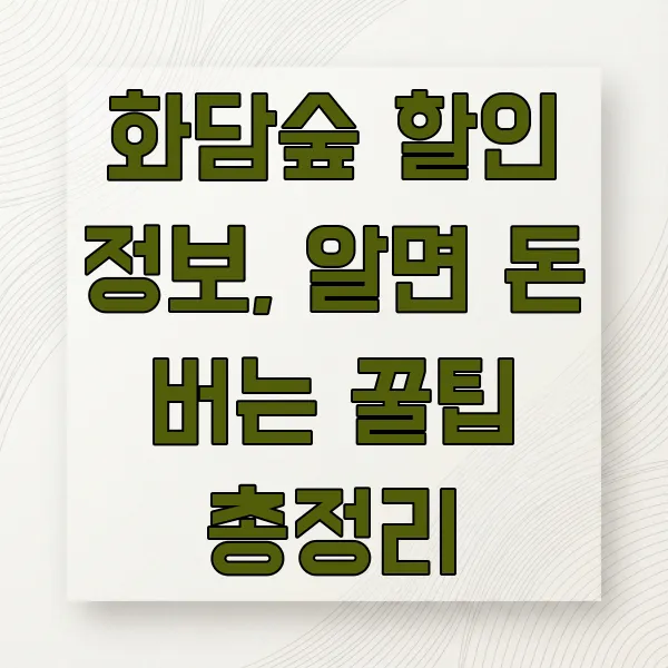 💡 인사이트: 화담숲 할인은 중복 적용이 되지 않는 경우가 대부분이에요. 따라서 여러 할인 혜택 중 본인에게 가장 유리한 것을 선택해야 합니다. 예를 들어, 경기도민 할인이 20%이고 온라인 예매 할인이 15%라면, 경기도민 할인을 받는 것이 더 이득이겠죠?